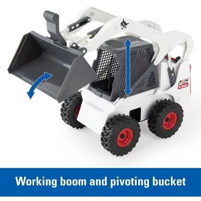 This item is part of the Big Farm line of playable kids toys by TOMY ERTL. The 1/16 scale Bobcat S450 Skid Steer Set comes with four construction barrels, four construction cones, four concrete blocks, a pallet and interchangeable bucket and forks. The skid steer features a working boom and pivoting bucket and working lights & sounds. Recommended for ages 3+ years – Great for play!