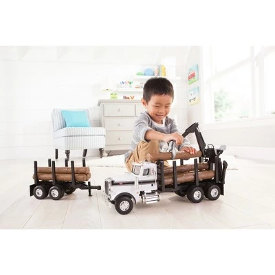 This Peterbilt model 367 toy truck with trailer features exceptional details for extra fun play times. The logging set-up on the rear of the truck has a spring loaded grapple hook and movable crane boom arm that puts kids in the operator’s seat for loading and unloading of the logs. Stabilizers on the rear of the truck bed and a safety bar at the rear of the cab bring more realism to the experience. With the included detachable pup trailer and 10 logs to load and unload, your child will be ready for hours of imaginative play.