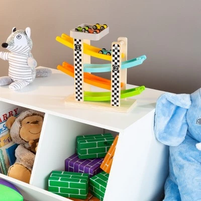 Ignite your child’s imagination with this Toy Time Ramp and 4-Piece Wooden Racecar Set. The cars are painted fun colors that will inspire your child’s sense of play, and the four-tier ramp will keep them entertained endlessly. This toy set is constructed to help children develop hand-eye coordination and spatial intelligence while keeping them entertained for hours.