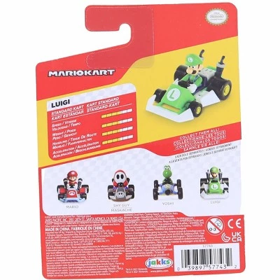 Bring home the excitement of the Super Mario video games with the Nintendo Super Mario Kart Racers Wave 5! You can recreate the action from the games with these racers of your favorites Super Mario characters. Ages 3 and up. The Nintendo Super Mario Kart Racers Wave 5 series includes Mario in Kart, Luigi in Kart, Shy Guy in Kart, and Yoshi in Mach 8 (each racer sold separately). Collect them all! Officially licensed.