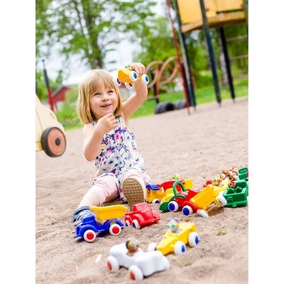 20- liter Bucket with 30 vehicles, including Cute Cars, Cute Racers, Chubbies, Pull-along Animals, Maxis. These cute toys are simple, brightly-colored, and most importantly, safe! Non-toxic, BPA-free and phthalate-free. Corners are rounded and have no sharp edges. Soft wheels are quiet and won’t scratch floors. Made to withstand tough play, indoors and out! Rust-proof stainless steel axles and bright, fade-resistant plastic stands up to sun exposure, cold weather, or rain. Dishwasher safe!