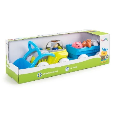 Tractor with trailer, 1 figure and 3 animals, fun color packed in giftbox. Suitable for indoor or outdoor play, pieces won’t fade or become brittle in any climate. Ready for the sandbox, playground, backyard, beach, or wherever your little one wants to play. Tractor measures 21cm. BPA and phthalate-free. All toys are recyclable.